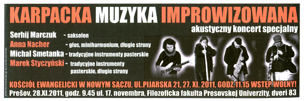 Będzie to prezentacja w ramach projektu prezentującego tradycyjne instrumenty Karpat w nowych kontekstach i jednocześnie kolejna edycja długostrunnej instalacji – międzynarodowy, karpacki akustyczny set muzyki improwizowanej zaprezentują: Anna Nacher (głos, long string installations), Marek Styczyński (long strings installation, karpackie instrumenty pasterskie), Michal Smetanka (karpackie instrumenty pasterskie), Serhij Marczuk (saksofon). Pokażemy także efekty pracy, jaka miała miejsce podczas polsko-słowackich warsztatów w Malym Lipniku na Słowacji. Więcej o warsztatach już wkrótce – liczymy także na zdjęcia i filmiki od uczestników, którym serdecznie i gorąco dziękujemy za fantastyczną atmosferę wytężonej pracy i znakomitej zabawy jednocześnie, wszystko w otoczeniu zamglonych i pokrytych szronem, tajemniczych bukowych lasów nad Popradem!